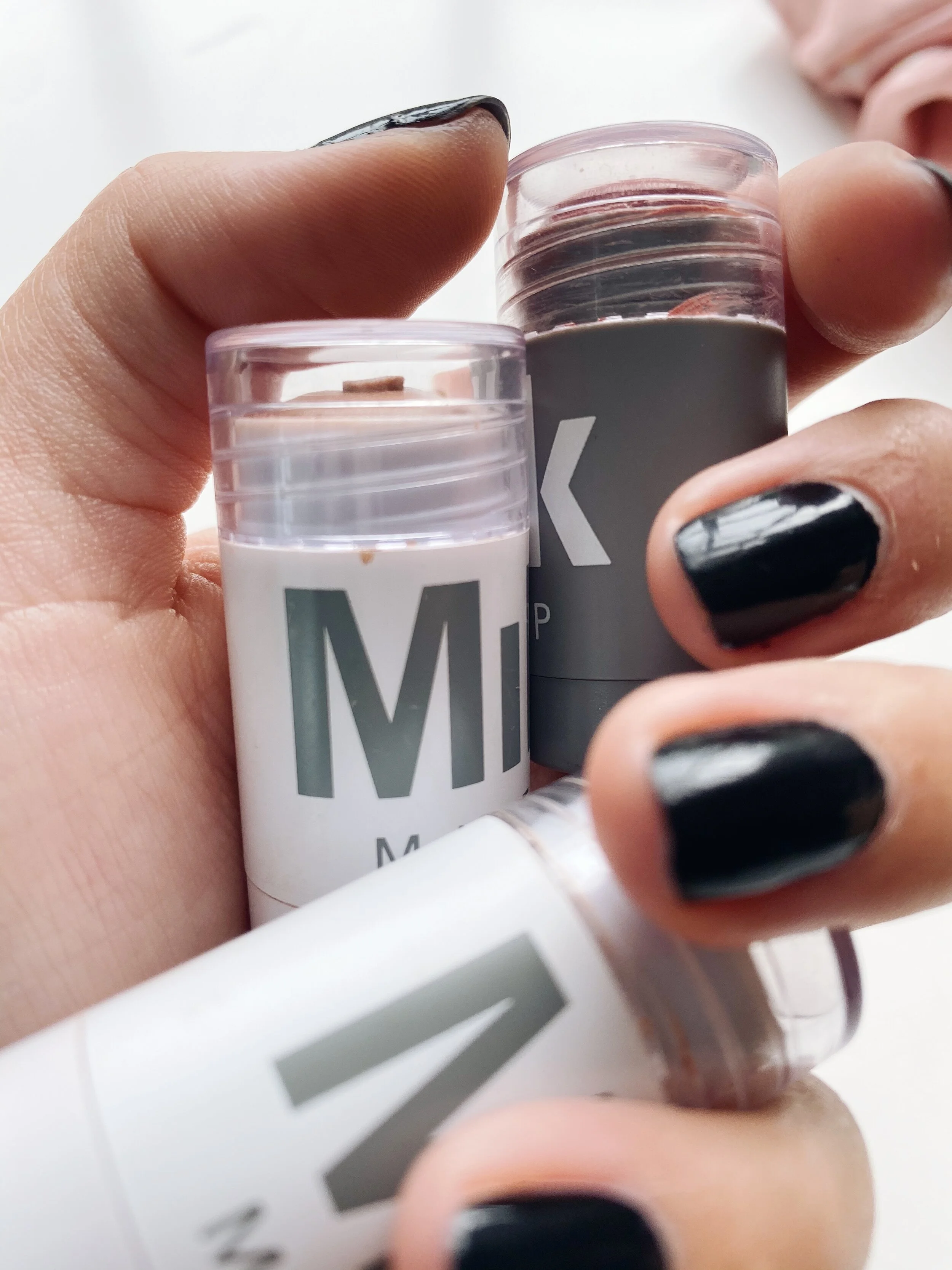 Then, I go in with my favorite cream makeup sticks from Milk Makeup. I use the matte bronzer stick in “Baked,” the lips and cheek stick in “Werk,” and the highlighter stick in “Lit.” I use a combination of my fingers and a beauty sponge to blend these out and make it look as natural as possible.