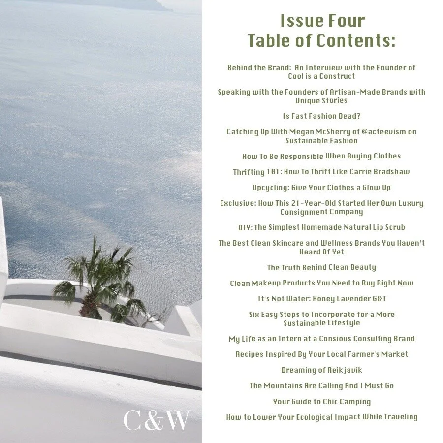 In this issue, we’re giving you the “green light” to go au naturel. Bringing you tips to practice a more sustainable life and truly appreciate nature in all its beauty, each section features easy and fun changes to incorporate in your daily lives. We’ve spoken with founders of some of our favorite eco-conscious brands, compiled the best sustainable products (no greenwashers allowed!), provided options for you to get closer with nature, and so much more. We hope Issue Four inspires you to go green!