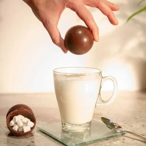 Start by melting your chocolate and smoothing it in a semi-circle silicone mold. Put this tray in the freezer for 5-10 minutes. Fill the chocolate mold with marshmallows or another topping of your choice. Place another semi-circle of chocolate on top, and seal the gap by smoothing some extra melted chocolate over it. Put it in the freezer to firm it afterwards. When you’re ready, place the hot chocolate bomb in a cup of hot milk and enjoy!