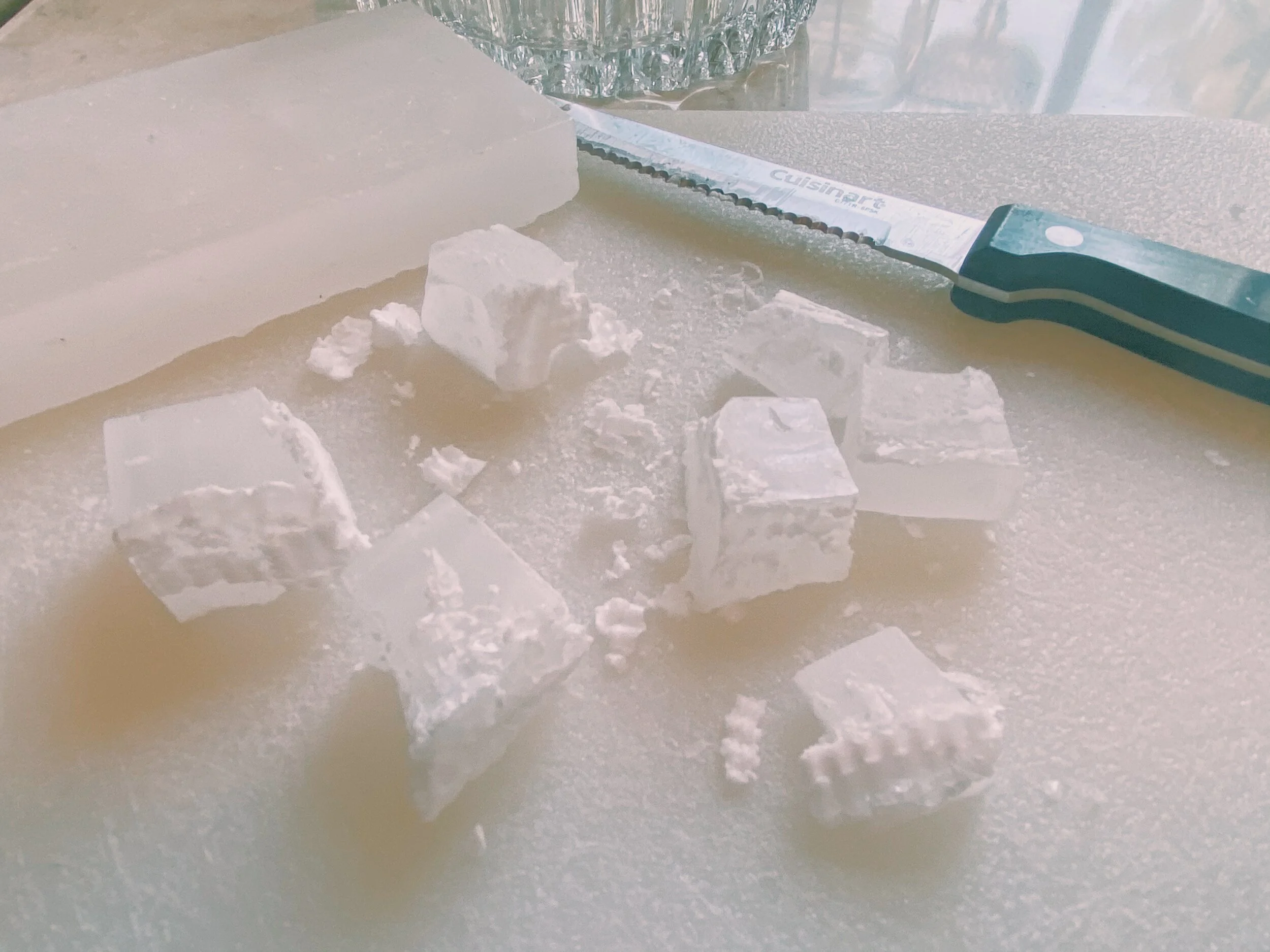 Measure out how much wax you would need to fill your container, then double it. That’s how much wax you will need to melt. For a quicker melting process, cut up the wax blocks into smaller pieces.