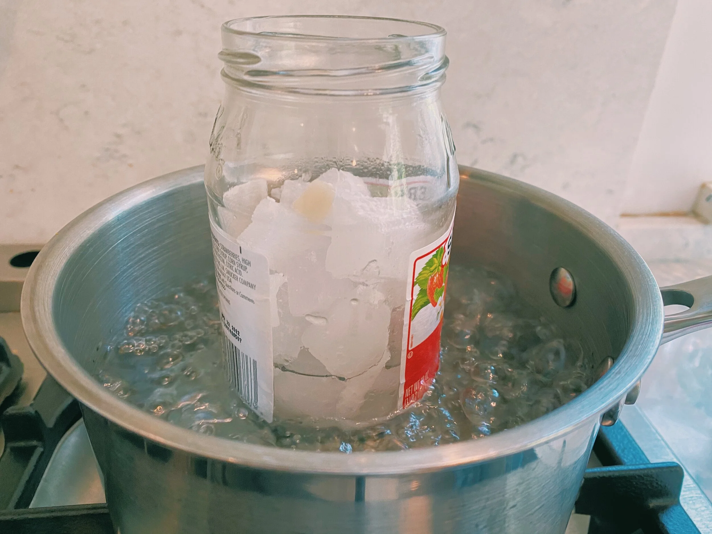 Next, you need to melt the wax. Create a water bath using a saucepan, an empty Smuckers jam jar or something similar, and a metal cookie cutter. Place the metal cookie cutter at the bottom of the saucepan and place the glass jar on top. Fill the saucepan with water until it hits approximately one inch of the jar. Set the heat on low and let the water boil.