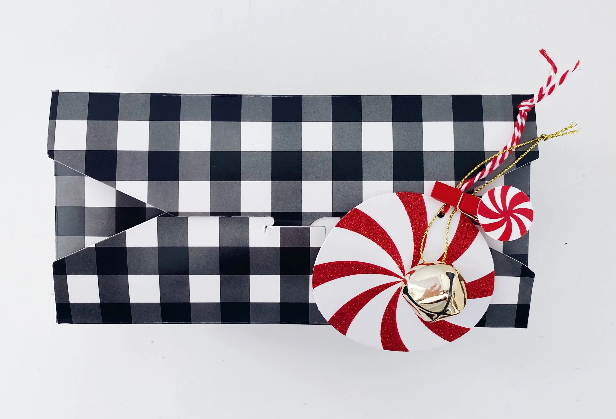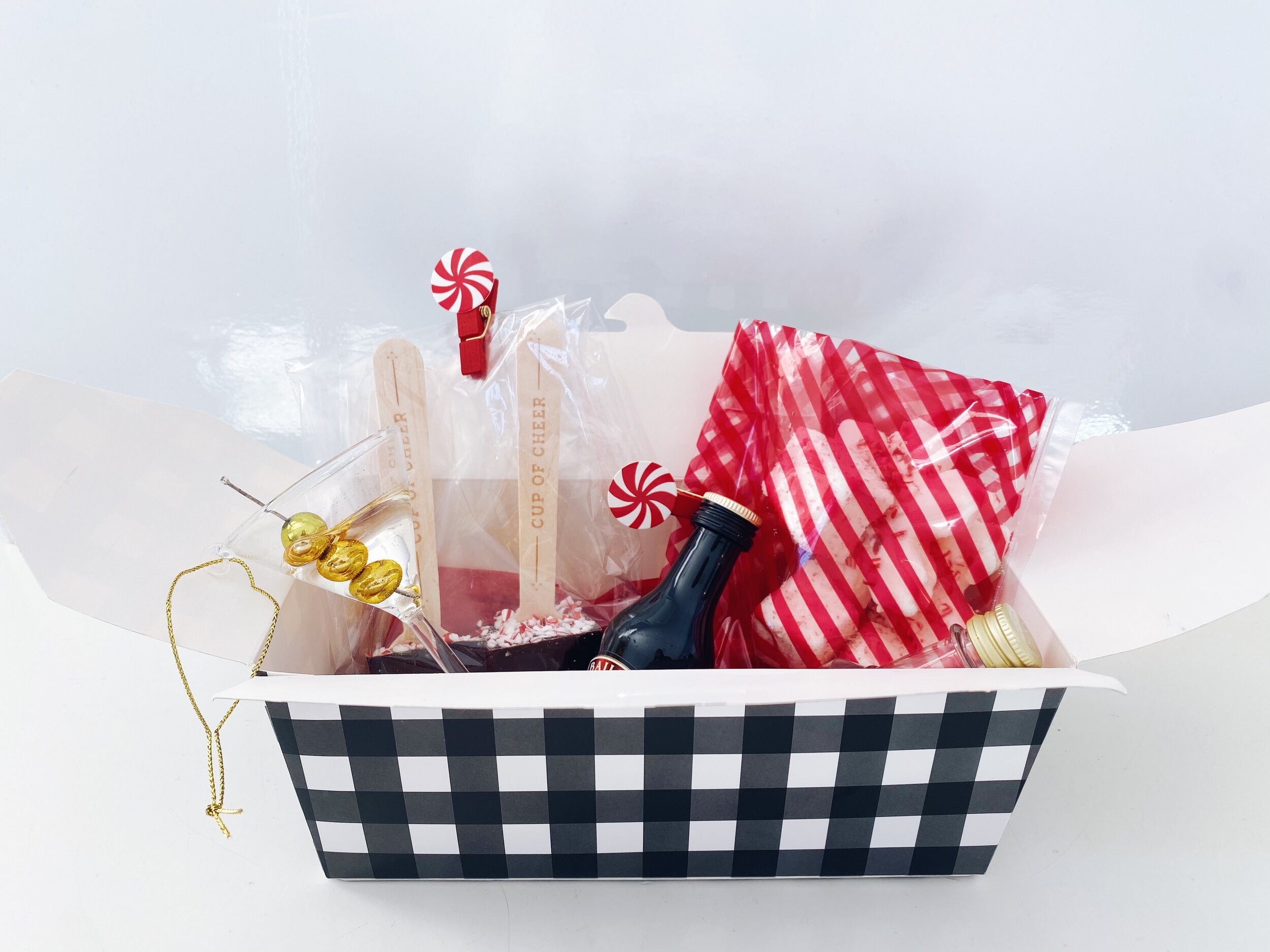 Then, for the actual gift, I included two hot chocolate stirring sticks (also found at Target) that dissolve to make hot chocolate when you stir them into hot milk. I also added a few festive peppermint marshmallows, a candy cane for stirring, and a cute drinking-themed ornament. You could also include a personal mug with their initial on it. Then, to make this hot chocolate kit boozy, add nips for your recipient to spike their drinks. I added a little bottle of Bailey’s, and Smirnoff whipped cream flavored vodka. A peppermint vodka would also go perfectly!