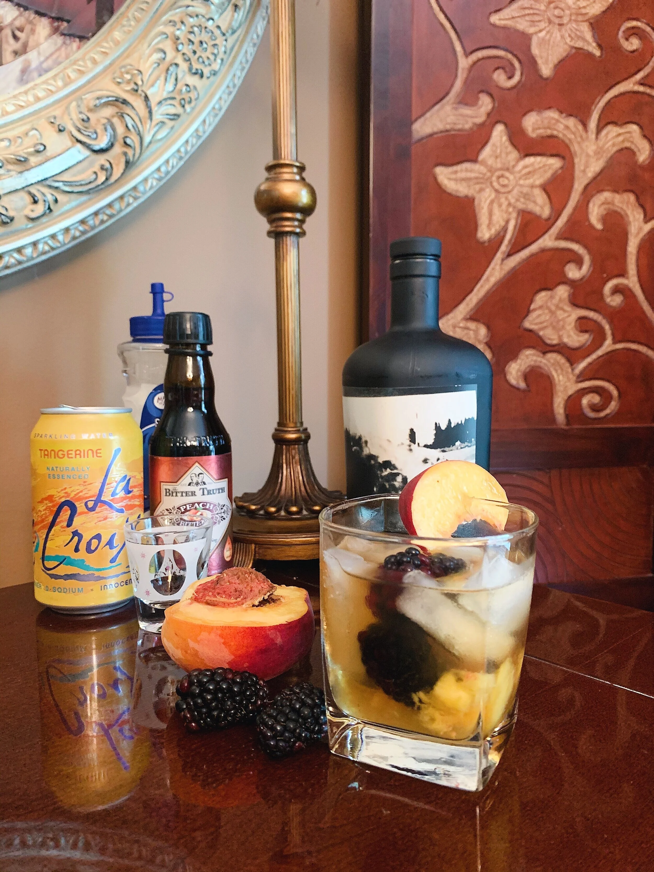 Finish it off with another peach slice, blackberries and a splash of sparkling water. Lightly stir.