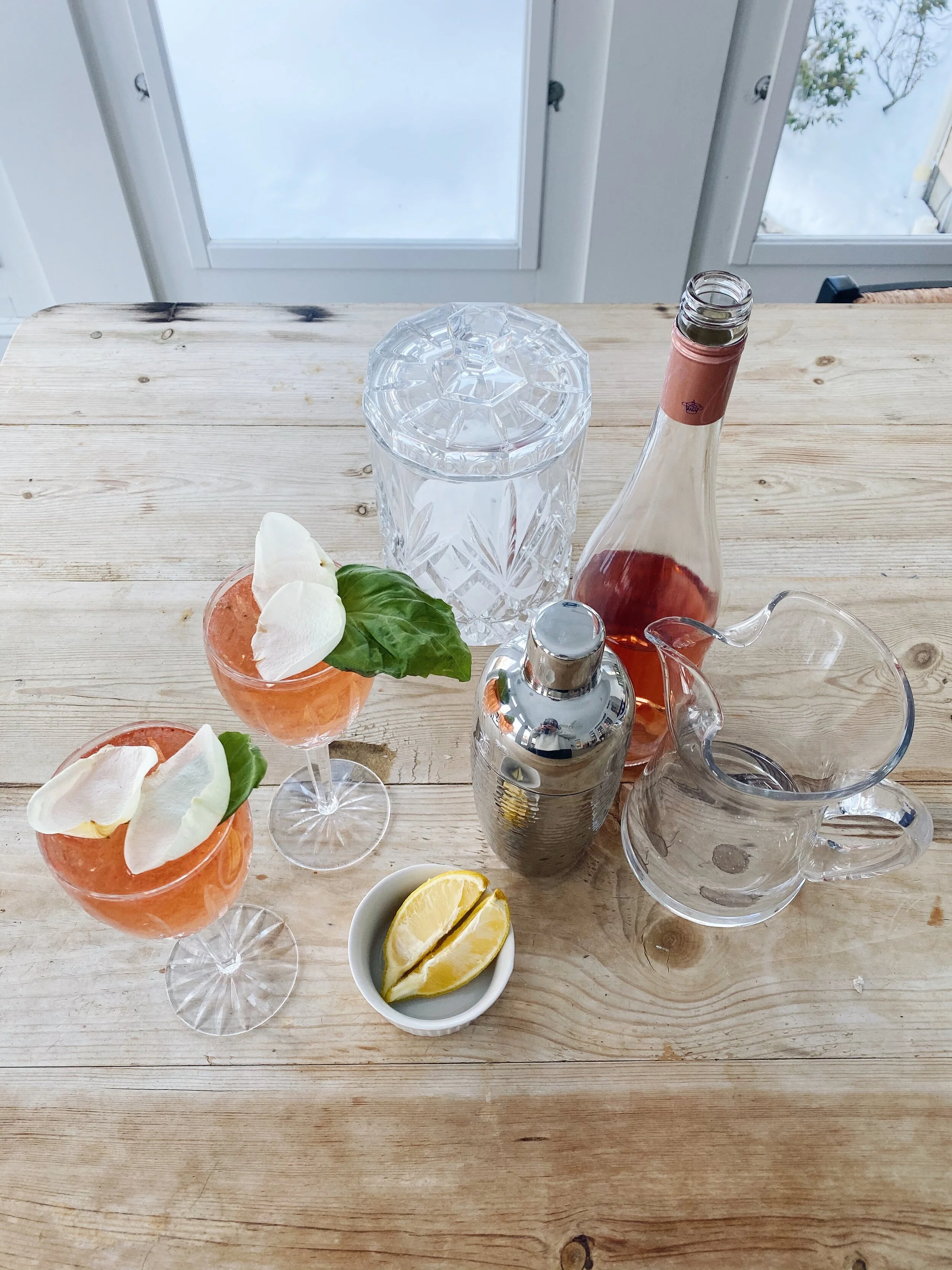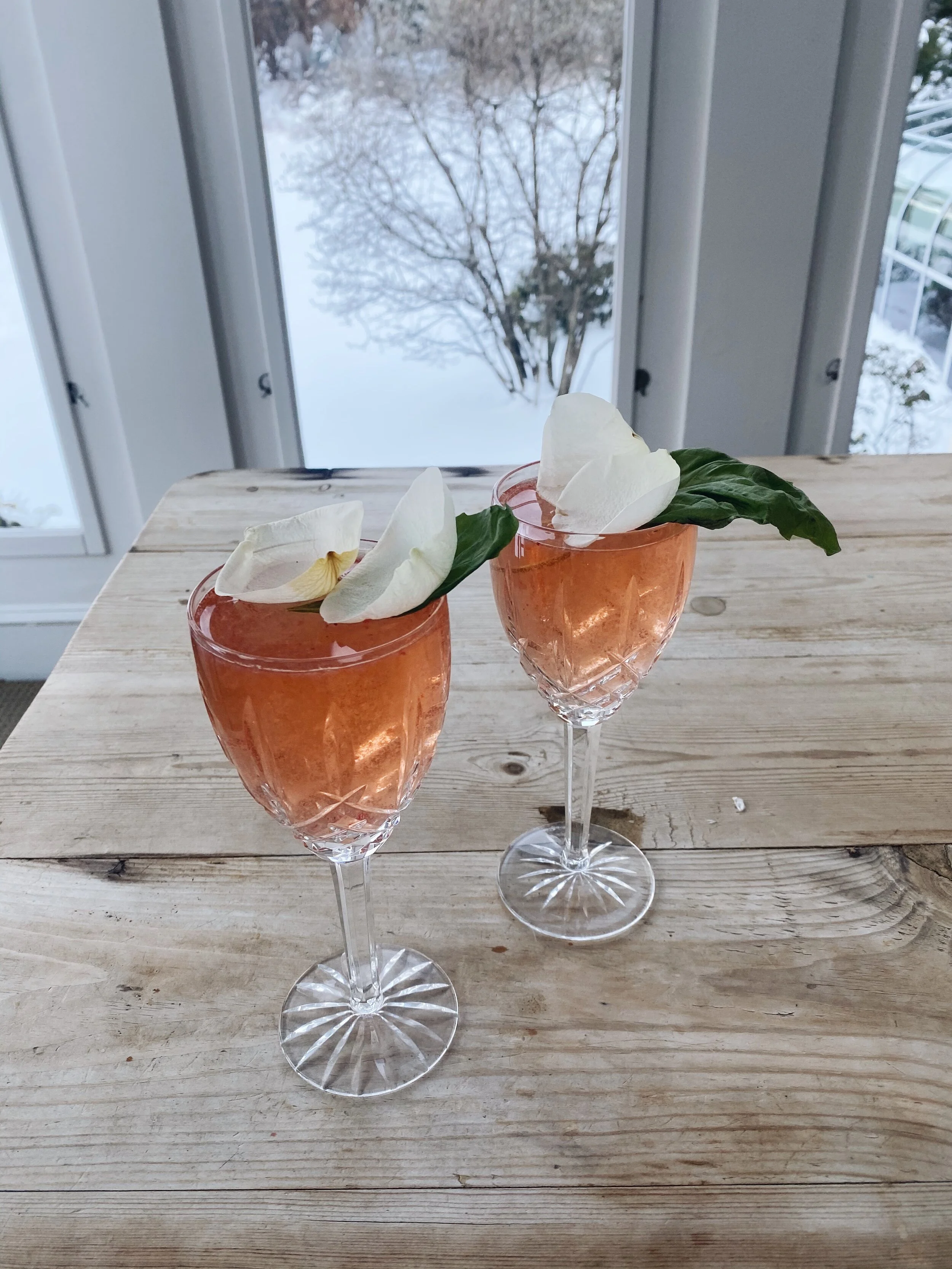 Pour your rosé of choice over the infused vodka. Top with sparkling water and garnish with a basil leaf and rose petals.