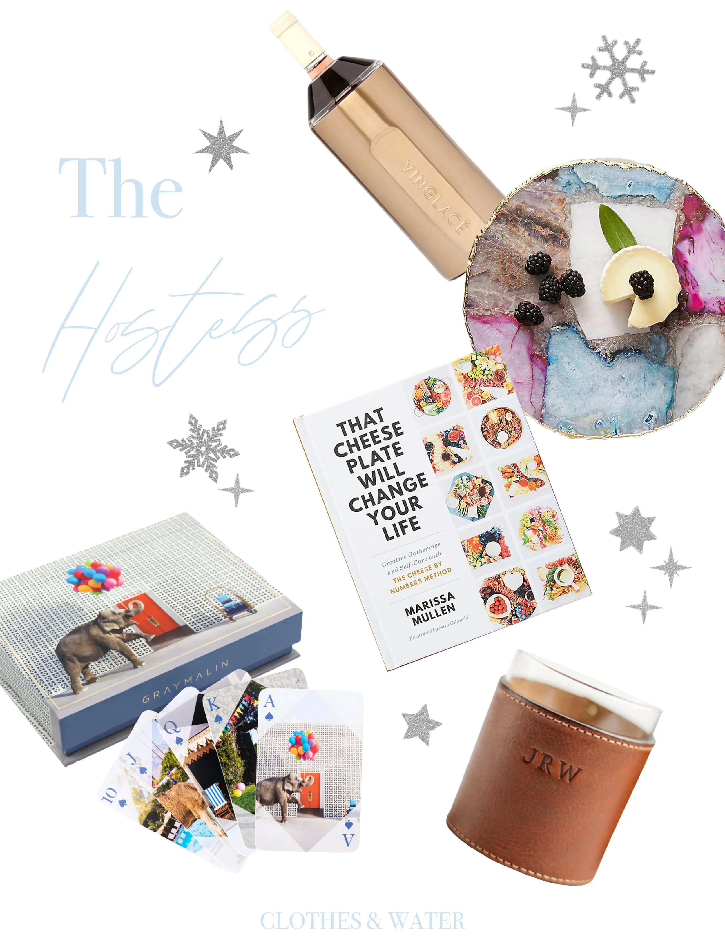 Wine Chiller, Vinglace, $89.95; Composite Agate Cheese Board, $78.00; That Cheese Plate Will Change Your Life, $28.00; Rocks Glasses, Clayton & Crume, $85.00; Playing Card Set, Gray Malin, $35.00