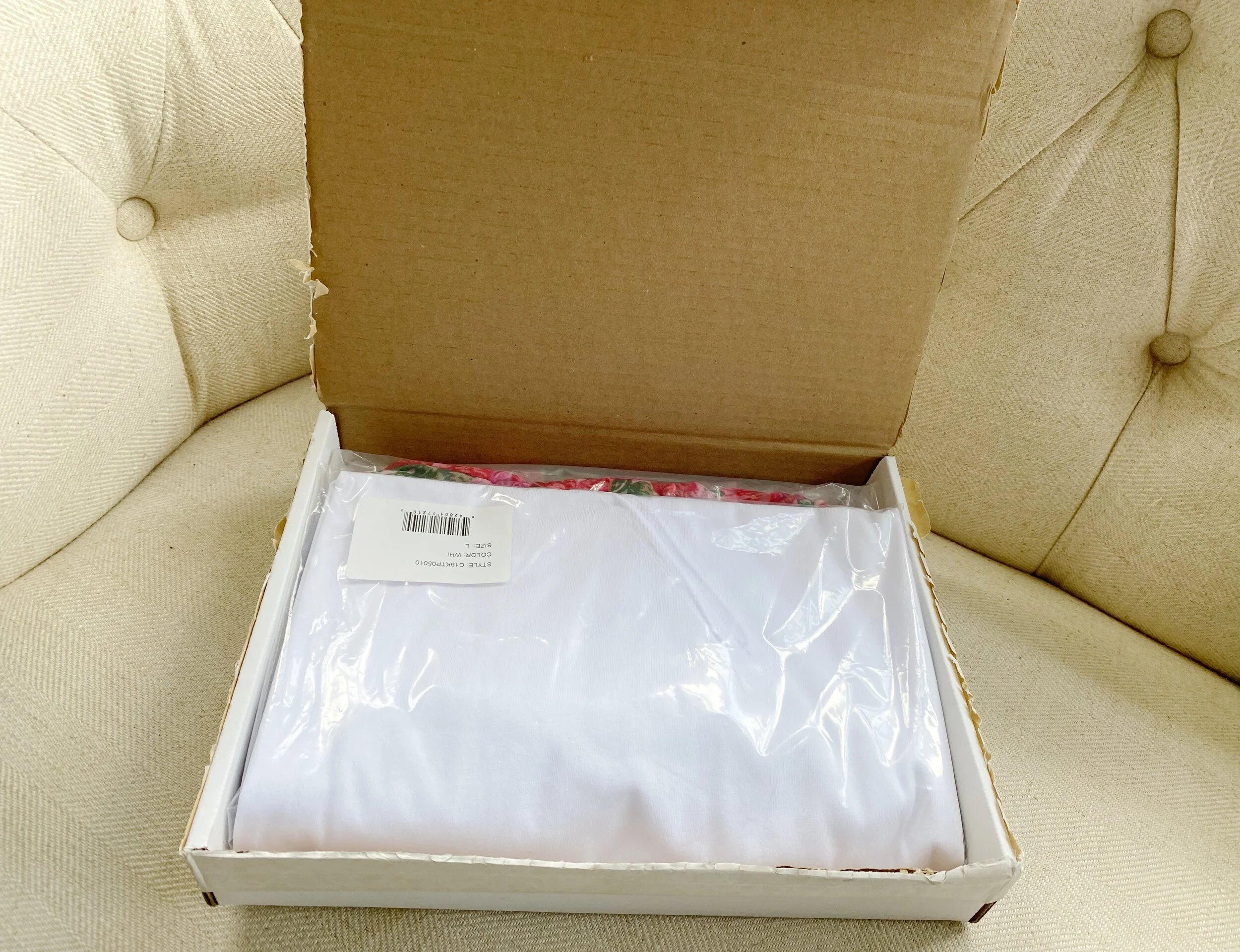 One week later, I received my Few Moda Mystery Box in the mail. Maybe I hyped it up a little too much, but who doesn’t love receiving presents in the mail?! As I opened up the cardboard box, I definitely was a bit caught off guard by what I was seeing. In the plastic wrapping, I noticed white t-shirt material and a very sparkly floral pattern.