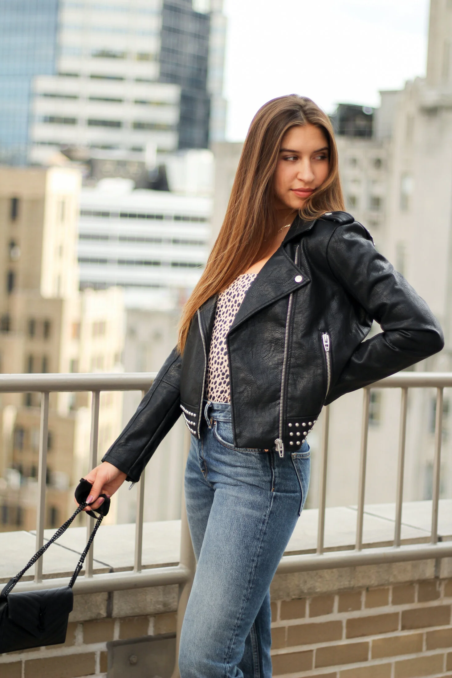 For a casual day out, we paired the Paloma One Piece with a camouflage cargo jacket, a ruffled black skirt from Princess Polly, a black bag with silver finishes, and a chic pair of sunglasses. For those late September and early October days, this look is serious perfection. If you’re looking to add more dimension to a mostly black look, wear your Paloma one piece on the Polka Dot side and throw on a cropped denim jacket.