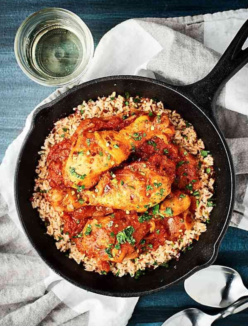 Even better, this recipe calls for white wine, which we always have on hand ;) To start, all you have to do is cut up your chicken, put it in a bowl covered with all the other ingredients, marinate for about half an hour, then boil it in the cast iron! Once it’s boiled, you reduce the heat & let it simmer until it’s cooked through.